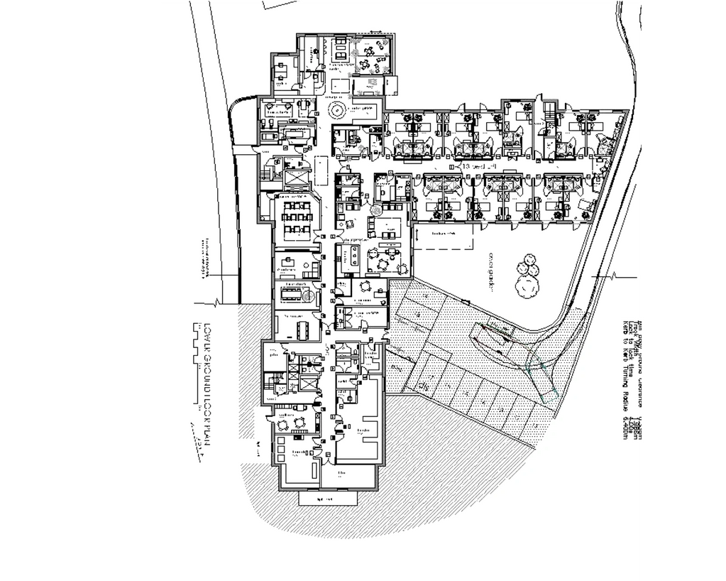 The Care home has back of house areas and staff parking built into the higher part of the site, and 2 separate garden (on the lower ground and ground floors), also take advantage of the level change.