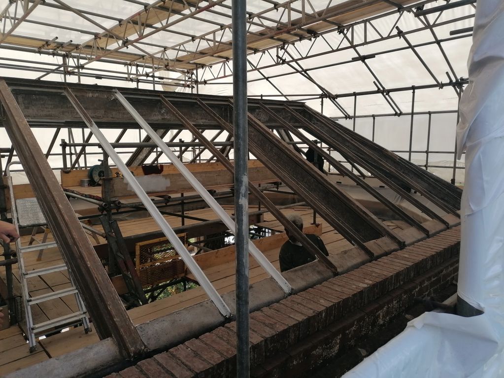Here works are underway, the existing glass has been removed and the structure is being carefully repaired.
